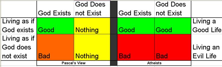 उत्तर: पास्कल का भगवान और ईश्वरीय शक्ति में गहरा विश्वास था। उसकी अक्सर नास्तिकों के साथ बहस भी हुआ करती थी। जिसमें पास्कल उनको जवाब देकर संतुष्ट करने का प्रयत्न किया करता था। बहुत बहस को अक्सर वह इस दलील से बात को खत्म कर दिया करता था कि ‘अगर वास्तव में ईश्वर का अस्तित्व है तो मुझे मरने के बाद बहुत अच्छे फल प्राप्त होंगे जबकि तुम घाटे में रहोगे। और अगर ईश्वर का अस्तित्व नहीं है तो मेरा और तुम्हारा अंजाम एक जैसा ही होगा। मरने के बाद हम सबका अंतिम संस्कार कर दिया जाएगा। इसलिये ईश्वर के अस्तित्व को मानना ही अधिक फायदेमन्द है।’